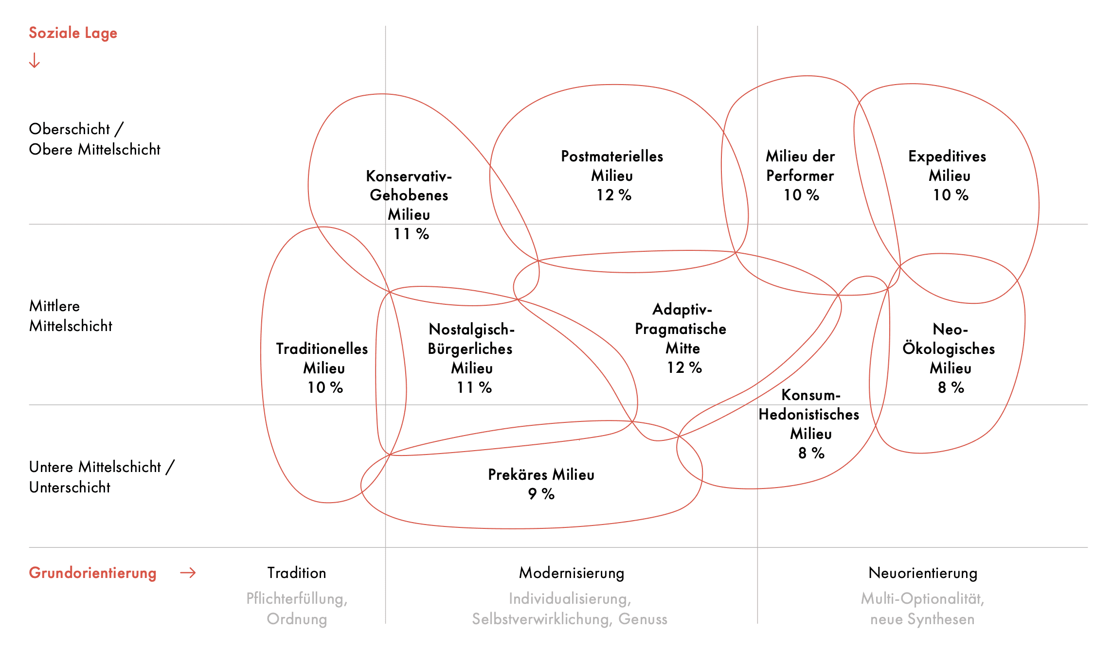 Menschen, die sich in Ihrer Lebensweise ähneln, werde in Gruppen (Milieus) zusammengefasst und entlang von zwei Achsen auf einem Koordinatensystem platziert. Eine Achse zeigt dabei die soziale Lage an und die andere die Grundorientierung (Tradition, Modernisierung, Neuorientierung). Da auch innerhalb einer Gruppe nicht alle Menschen gleich sind, werden die Gruppen nicht in starre Schubladen gesteckt, sondern in Blasen dargestellt, die sich überschneiden können. Auch Einstellungen zu Arbeit, Familie, Medienkonsum und anderem werden erhoben und berücksichtigt. Das Ergebnis ist ein Abbild unserer Gesellschaft auf einem Koordinatensystem: Jede/r in ihrer/seiner Blase.